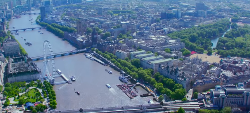 In this aerial view of the Thames, Charing Cross station is located in the extreme bottom right with St. James’s Park and its lake above.